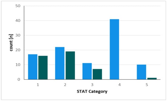 The distribution of cases according to the Society of Thoracic Surgeons-European Association for Cardio-Thoracic Surgery Mortality (STAT) category is shown. Blue columns represent the absolute number of cases in the DET group, the green columns represent the cases in the OTE group.
