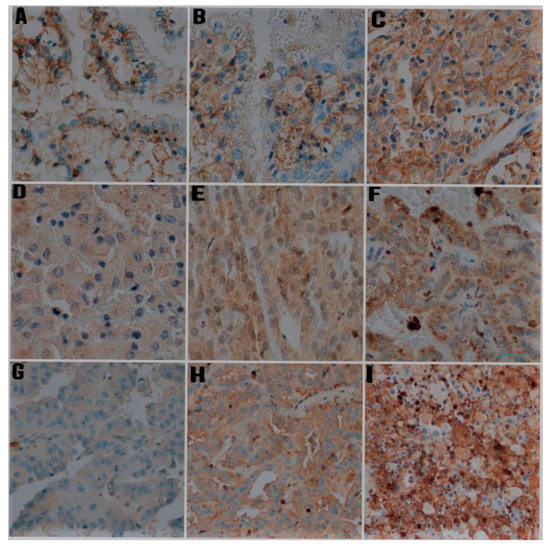 Representative photomicrographs of immunohistochemical staining for CD44, MMP-2, and MMP-9 in papillary renal cell carcinoma (IHC, ×400). (A) Weak staining intensity for CD44, (B) intermediate staining intensity for CD44, (C) strong intensity for CD44, (D) Weak staining intensity for MMP-2, (E) intermediate staining intensity for MMP-2, (F) strong intensity for MMP-2, (G) Weak staining intensity for MMP-9, (H) intermediate staining intensity for MMP-9, (I) strong intensity for MMP-9.