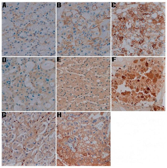 Representative photomicrographs of immunohistochemical staining for CD44, MMP-2, and MMP-9 in chromophobe renal cell carcinoma (IHC, ×400). (A) Weak staining intensity for CD44, (B) intermediate staining intensity for CD44, (C) strong intensity for CD44, (D) Weak staining intensity for MMP-2, (E) intermediate staining intensity for MMP-2, (F) strong intensity for MMP-2, (G) Weak staining intensity for MMP-9, (H) intermediate staining intensity for MMP-9.