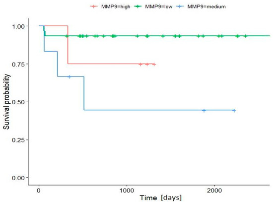 In the pRCC group, the results of statistical analysis demonstrated that the Ki-67 and CD44 expressions were not a significant factor affecting the overall survival (OS) of patients (p > 0.05). In the group with moderate and high MMP-2 expression, there was 100% OS. In the group with low MMP-2 expression, the OS was shorter (76.5%); however, the statistical analysis did not reach a significant result (p > 0.05). There was only a positive correlation between increased MMP-9 expression and shorter OS (p < 0.05). Patients with low MMP-9 expression show longer OS (93.5%) then patients with increased (moderate and high) MMP-9 expression (44.4% and 75.0% respectively). The shortest OS was observed in the group with moderate MMP-9 expression. All deaths were observed during the first 2 years after surgery (Figure 3).