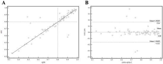 In the 74 vessels that underwent coronary hemodynamic assessment by both QFR and OFR, a good correlation was found between OFR and QFR (r = 0.86 (95% CI: 0.78 to 0.91); p < 0.001). The Bland–Altman analysis showed no significant difference between OFR and QFR (mean difference = 0.00; SD difference = 0.08; p = 0.782), as presented in Figure 2.