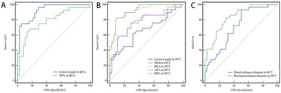 Comparison of receiver operating curves for the discrimination of coronary hemodynamic deficiency. (A) Comparison of receiver-operating curves for Lesion length and DS% in QCA; (B) Comparison of receiver-operating curves for Lesion length, MLA, MLD, AS%, DS% in OCT; (C) Comparison of receiver-operating curves for Distal and proximal reference diameters in OCT. ROC = receiver operating curve, QCA = quantitative coronary angiography, DS% = percent diameter stenosis, OCT = optical coherence tomography, MLA = minimal lumen area, MLD = minimal lumen diameter, AS% = percent area stenosis, OFR = optical flow ratio.