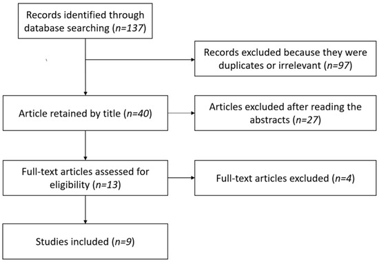 Our research found 137 results. Out of these records, we retained 40 articles by title. After removing duplicates and reading abstracts, 13 articles were assessed for full-text reading. We excluded one of them because it did not explore patients with routine electrophysiological assessment [24], and another because it included only two patients [25]. Another article was excluded because it did not differentiate NTOS from other plexopathies [26]. One article was excluded because it presented results of pre-surgery electrophysiological evaluations [27]. Finally, we included nine articles [14,17,28,29,30,31,32,33,34] (Figure 1). Three studies were eligible for meta-analysis [28,29,32]. Because they were all retrospective studies of similar methodological quality, they were not weighted by results based on methodology. Given the small number of studies included in this meta-analysis, it was not surprising to find large 95% confidence intervals.