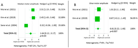 Forest plots of the motor nerve conduction studies for median (A) and ulnar (B) nerves [28,29,32]. Abbreviations: CI: confidence interval; NTOS: neurogenic thoracic outlet syndrome.