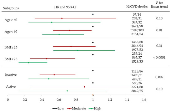 Multivariable-adjusted hazard ratios (HRs) and 95% confidence intervals (CIs) of cardiovascular disease (CVD) mortality across fitness (low, moderate, and high) and age (<60 and ≥60), body mass index (BMI, 18.5–25 and ≥25), and physical activity (inactive and active) groups. Adjusted according to baseline age, examination year, total cholesterol, current smoking (yes or no), heavy alcohol intake (yes or no), physically inactive (yes or no), BMI (kg/m2), parental history of CVD, and presence or absence of hypertension or diabetes.