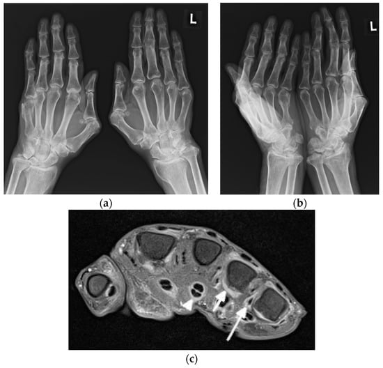 A 63-year-old male with systemic lupus erythematosus and Jaccoud’s deformities on clinical examination. (a) Posterior–anterior and (b) oblique radiographs of the bilateral hands show ulnar deviation of the lesser finger phalanges of the right hand, with malalignment of the 3rd–5th digits proximal interphalangeal (PIP) joints that are more apparent in (b). They also show contracture at the 3rd PIP joint of the left hand, osteoarthritis of the bilateral wrists and scattering of the metacarpophalangeal (MCP) joints, bilateral positive ulnar variance, and posttraumatic deformities of the bilateral distal radial metaphysis and of the distal right 5th metacarpal. (c) Axial postcontrast T1-weighted magnetic resonance image with fat saturation of the right hand shows MCP joints 2, 4, and 5 synovitis (short arrow pointing to MCP 4), MCP 2, 4, and 5 capsular enhancement (long arrow pointing to MCP 5), and 2–5 flexor tendons tenosynovitis (arrowhead pointing to middle finger flexor tendon sheath).