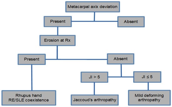 Spronk et al. developed criteria to describe the severity of Jaccoud deformities [], primarily based on the metacarpal axis deviation, and whether they are reversible or not based on the so-called Jaccoud’s index [] (Table 1). Three different forms of deforming arthropathy in this disease were later proposed as follows: Jaccoud’s arthropathy (JA), mild deforming arthropathy (with less deformities), and the erosive form of SLE, called rhupus (Figure 3) [].