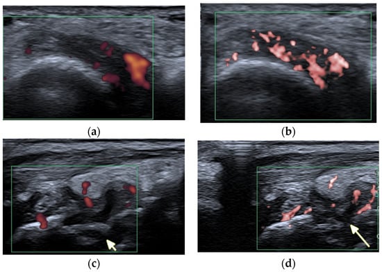 A 57-year-old patient with systemic lupus erythematosus. (a) Short-axis power Doppler and (b) superb micro-vascular imaging (SMI) ultrasound (US) images of the distal radioulnar joint. (c) Long-axis power Doppler and (d) SMI US images at the dorsal aspect of the radiocarpal and midcarpal joints show joint effusions and hyperemia consistent with synovitis with more vessels seen with SMI (b,d). Note an intra-osseous cyst-like change (short arrow) and cortical erosion (long arrow in (d)) in the carpal bone related to rhupus syndrome.