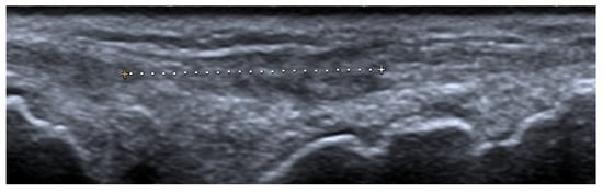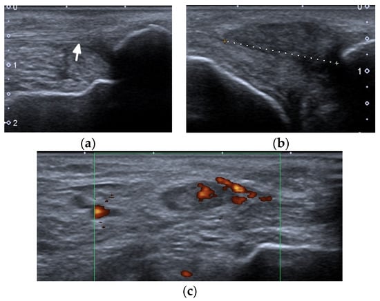 Spontaneous tendon ruptures are a rare complication of SLE. US is the foremost imaging modality for tendon pathologies, since it is more sensitive than clinical examinations and MRI for detecting pathological structural changes within tendons []. The degree of tendon inflammation in rheumatologic diseases, namely tenosynovitis, paratenonitis, or tendinitis, as well as the extent of tendon damage, can be evaluated []. In such cases, US is able to depict tenosynovial effusion, tenosynovial thickening, and hyperemia, as well as tendon tears (partial, full-thickness, incomplete, or complete) [,]. In a literature search by Ceccarelli et al. [], the prevalence of tenosynovitis ranged between 4% to 57%. Ostendorf et al. [] in the MRI of the hands of 14 patients with SLE, found tendon sheath effusion (“edematous tenosynovitis”) in 42%.