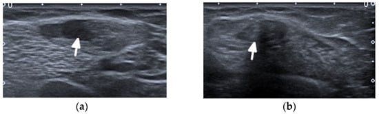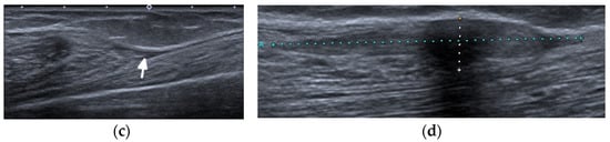 US may assist with the diagnosis and characterization of disease activity in inflammatory myopathies, with reported 82.9% sensitivity for detecting histologically proven myositis []. Inflammation and edema cause patchy or diffusely increased echogenicity of muscles, which may also appear swollen [,]. Increased vascularity on power Doppler may be seen []. In chronic diseases, the muscles appear atrophic with reduced volume and further increased echogenicity due to the progressive infiltration of fatty tissue [,,]. In addition, by shear-wave elastography (SWE), US is able to evaluate muscle stiffness []. Di Matteo et al. [] performed SWE on the quadriceps muscles in 30 SLE patients (without previous/current myositis or neuromuscular disorders) as well as 15 healthy subjects that matched the patients in age, sex, and BMI. SWE was significantly lower in SLE patients compared with the healthy subjects (1.5 m/s vs. 1.6 m/s respectively, p = 0.01).