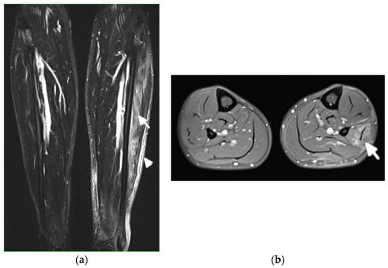 MRI is the most appropriate modality for the evaluation of muscle involvement, despite its low specificity, and US plays a complementary role [,] (Figure 9). MRI is used in the differential diagnosis and as a follow-up to a therapeutic response, and is useful to define the biopsy site [,]. Fat-saturated, fluid-sensitive MR sequences with long time until echo recovery are the most sensitive for identifying acute inflammation, manifesting as areas of high signals within the muscle []. Inflamed muscles also demonstrate contrast enhancement (Figure 9). In the chronic phase, involved muscles may undergo fatty infiltration with or without a loss of muscle bulk. These are seen on MRIs on T1-weighted sequences as areas of high signal intensity, replacing the normal intermediate signal of muscle fibers [].