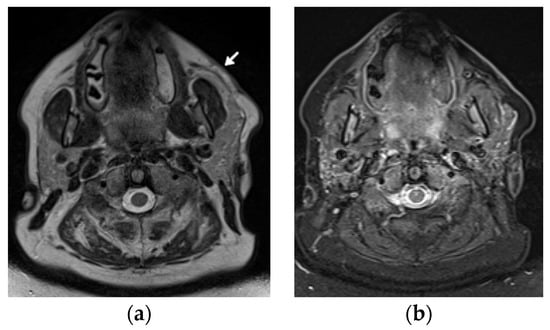 A 48-year-old female patient with systemic lupous erythematosus and a long history of lupus panniculitis and post-inflammatory atrophy of the subcutaneous tissues of the left cheek without active inflammation (arrow), seen in (a) the axial T2-weighted time spin echo and (b) T2 turbo inversion recovery magnitude MR images.