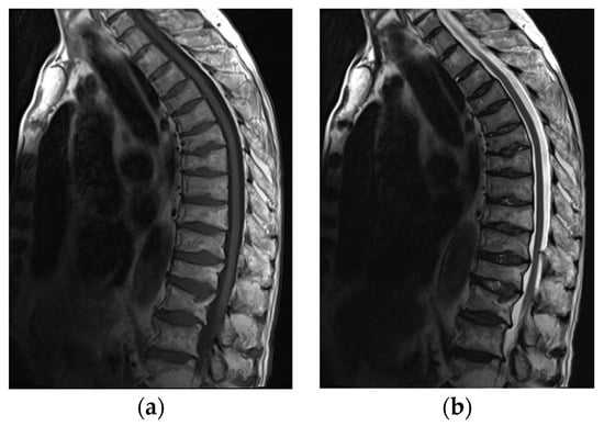 MRI of the spine in a 61-year-old patient with systemic lupus erythematosus with multiple compression fractures. (a) Sagittal T1-weighted and (b) T2-weighted Time Spin Echo MR images of the thoracic spine show a loss of height in nearly all thoracic and L1 and L2 vertebral bodies without significant bone marrow edema in (b). This is consistent with chronic compression fractures with associated disc dehydration and marginal endplate osteophytes, but without significant retropulsion.