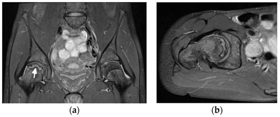 Conventional radiography typically does not show any distinct pathology in the early phase of the disease, whereas the presence of subchondral sclerosis already infers irreversible osseous damage [] (Figure 1). Abnormal findings in ON include a ‘crescent sign’, representing subchondral collapse; cyst-like or sclerotic changes; an abnormal contour; and the collapse of the femoral head with subsequent secondary degenerative changes []. MRI is the most sensitive modality in the diagnosis and quantification of the extent of ON [,,]. Classic findings of medullary bone edema are observed on the fluid-sensitive sequences with fat saturation, with linear areas of low signal intensity inside representing the separation of normal and necrotic bones and the outer increased linear signal related to the vascularity of granulation tissue [,]. Whole-body MRIs may detect multifocal ON. Bone scans are less specific for the diagnosis of ON. Other limitations include the radiation dose, poor spatial resolution, and inability to quantify the lesion for prognostic purposes [].
