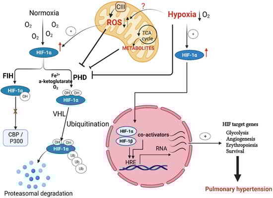 In addition, the impairment of the mitochondria ROS–HIF pathway leading to glycolysis and impaired energy metabolism was implicated in PAH and cancer pathogenesis, [58]. Although hypoxia may contribute to mitochondrial dysfunction, the impact of different ROS and mechanisms by which mitochondria-derived ROS (mtROS) promote HIF1α regulation in PH pathogenesis is not clearly defined. There has been significant debate in the literature about whether mitochondrial ROS increases or decreases during acute and chronic hypoxia-induced PH [4,30,37,68,69,70,71,72].