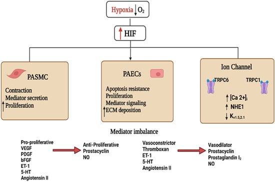 Upon extended exposure to low oxygen levels (chronic hypoxia), HIF isoforms activate the transcription of a variety of genes (Figure 2) that regulate the metabolism and proliferation of pulmonary vascular cells, blood vessel tone, and angiogenesis [18]. Previous studies showed that changes in the PASMCs are the critical processes of PH development after hypoxia exposure [36,37].