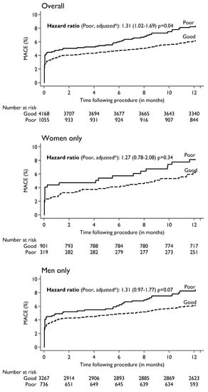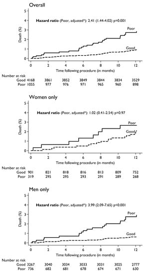 The following supporting information can be downloaded at: https://www.mdpi.com/article/10.3390/jcm11175231/s1, Table S1: Baseline Characteristics of patients by availability of pre-procedure HRQoL; Table S2: Pre-procedure HRQoL and its association with mortality and MACE within one-year following procedure in the overall patients and by sex.
