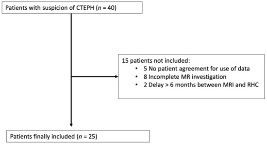 All consecutive patients with suspected CTEPH and evaluated by both cardiac MRI and RHC at our institution over a period of 3 years were considered for inclusion in this retrospective study. The suspicion of CTEPH was based on the presence of suggestive symptoms and pulmonary perfusion anomalies as assessed by at least ventilation/perfusion scintigraphy and CT angiography as recommended [19]. Criteria of exclusion were: no patient agreement for the use of the data (n = 5), incomplete MR investigation (n = 8) and a delay > 6 months between cardiac MRI and RHC (n = 2). In total, 25 patients were included (Figure 1).