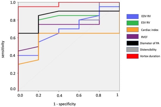 To evaluate the performance of cardiac MRI in detecting PH, patients were subdivided in a positive group (with PH) and a negative group (without PH). The highest areas under the curve (AUC) for participants with PH as opposed to participants without PH were obtained for vortex duration measured with MRI with AUCs of 0.860 [95% CI: 0.637, 1] and 0.896 [95% CI: 0.597, 1] for a PH definition threshold of >20 mmHg and ≥25 mmHg, respectively. Right ventricular volumes; RVEF, RV cardiac index, mean diameter of PA and pulmonary distensibility showed lower AUCs but no significant differences (p > 0.1) were noted between AUCs (Table 4 and Table 5, and Figure 3). Youden index showed that a vortex duration of 8.6% of cardiac cycle provided a 95% sensitivity and an 83% specificity to detect PH (defined as a pulmonary pressure > 20 mmHg). If a cut-off of ≥25 mmHg was used to define PH, the vortex duration increased to 10.0% of cardiac cycle, providing a 100% sensitivity and a 78% specificity to detect PH.