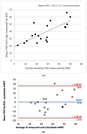 In patients with pulmonary hypertension defined as mPAP > 20 mmHg (n = 19), vortex duration showed good correlation with the mPAP (r = 0.745; p < 0.0001) (Figure 4A). Linear regression analysis between vortex duration and mPAP revealed that the corresponding linear regression equation was mPAP (mmHg) = 19.2 + 0.7 × vortex duration (%). The comparison of the mPAP as measured by RHC and as calculated resulted in a nonsignificant bias of 0.18 mmHg. The SD of differences was 9.4 mmHg, and 95% limits of agreement were 18.0 and −17.4 mmHg (Figure 4B).