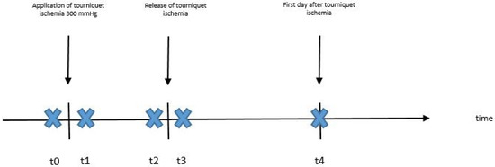 The study was approved by the institutional ethics committee (310_19 B9). Twenty patients received an operation on one of their hands and tourniquet ischemia was applied. Furthermore, 20 healthy participants, who voluntarily participated in the study, received 10 min of tourniquet ischemia in one of their arms. Both patients and healthy participants were prospectively included in the study. In both groups, the tourniquet pressure was set at 300 mmHg, which is the standardized pressure for adults in our clinic and, after exsanguination, measurements of tissue oxygen saturation and skin temperature of the dorsum of the hand were performed at five different timepoints. The first measurement (t0) was performed just before application of the tourniquet ischemia, the second (t1) directly after application of the tourniquet ischemia, the third (t2) before release of the ischemia, the fourth (t3) directly after release of the ischemia and the last (t4) was performed on the following day (Figure 1). The number of healthy participants was chosen according to the number of patients, and both subgroups were equal in size and similar in gender ratio and age composition.