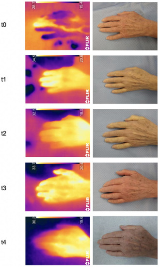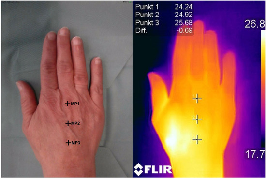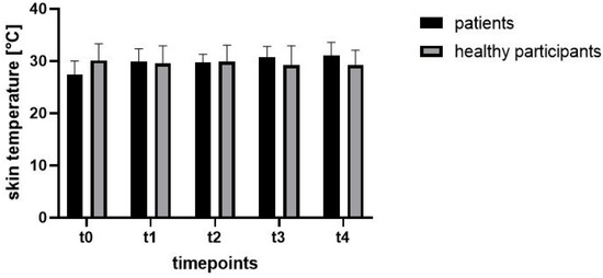 Both patients who received surgery on the corresponding hand and healthy participants were examined with a longer follow-up of 24 h compared to other studies [20,21]. Interestingly, the measured skin temperature in the patient group showed an increase during the observation period, while it continuously decreased in the group of the healthy participants. However, that certain differences were measured between these two groups is not surprising, as the patient group had an additional influencing factor: the manipulation of the operation itself.