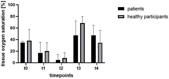 In both groups, tissue oxygen saturation dropped after the application of the tourniquet ischemia compared to t0 and increased after the release of the tourniquet ischemia. In both groups, the tissue oxygen saturation decreased from timepoint t3 to t4 but resulted in higher levels compared to t0 in the patient group, while measured values at t4 in the participant group dropped to the level of t0. The decrease in saturation during ischemia was expected. The results of this study using two different imaging modalities confirmed the subsequent rapid increase in saturation to baseline or even beyond as has already been described in other studies.