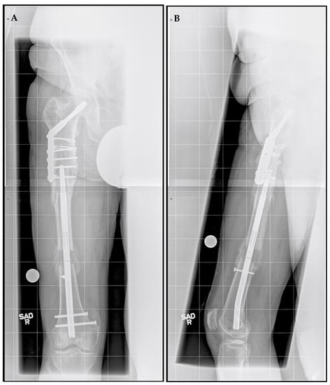 Post-traumatic femoral lengthening in a 71-year-old male patient, shown here postoperatively. (A) Anteroposterior and (B) lateral of the right femur after osteoplasty and the insertion of the Precice MILN. Gray dots on the bottom represent X-ray calibration spheres.