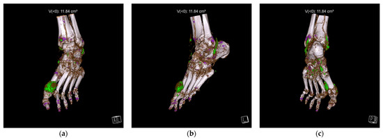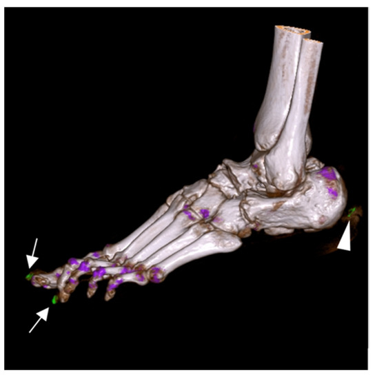 - Park, E.H.; Yoo, W.H.; Song, Y.S.; Byon, J.H.; Pak, J.; Choi, Y. Not All Green Is Tophi: The Importance of Optimizing Minimum Attenuation and Using a Tin Filter to Minimize Clumpy Artifacts on Foot and Ankle Dual-Energy CT. AJR Am. J. Roentgenol. 2020, 214, 1335–1342. [Google Scholar] [CrossRef] [PubMed]