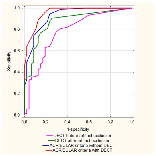 For each of the diagnostic methods (DECT alone, ACR/EULAR classification criteria without DECT, and ACR/EULAR classification criteria with DECT), the sensitivity and specificity were calculated, and the receiver operating characteristic (ROC) curves were obtained with the calculation of the area under the curve (AUC). The compliance of the data with the normal distribution was assessed using the Shapiro–Wilk test. The significance of the observed differences between the two groups was assessed using the Student’s t-test for variables with a normal distribution, the Mann–Whitney U test for variables without a normal distribution, and the chi-square test or Fisher’s exact test (for tables with values less than 5) for categorical variables. In multivariate analysis, logistic regression analysis was used. Statistical significance was set at p < 0.05. Statistical analysis was performed using Statistica 13.3 software (StatSoft Polska, Kraków, Poland).