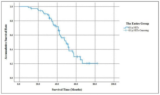 Kaplan–Meier estimates for the OS of the entire group of G3 p-NETs defined by the WHO 2017 grading classification.