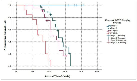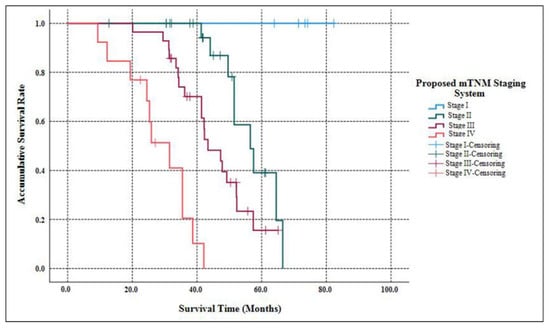 As Table 2 listed, the median follow-up time of our study was 58.3 months (ranging from 9.7 months to 182.6 months ). When the follow-up ended, 10 patients were out of contact (12.5%). There were 39 deaths related to the disease progression (55.7%). The accumulative 5-year OS of G3 p-NETs was 29.7% (Figure 1), with an MST of 49.2 months (95% CIs: 41.8 months–56.5 months ). The accumulated 5-year OS from current AJCC Stage I to Stage IV was 100.0%, 31.3%, 17.1% and not applicable (NA), respectively (Figure 2). Patients classified using the current AJCC Stage I had better survival than those in Stage II (p = 0.003), Stage III (p = 0.006) and Stage IV (p < 0.001), as well as when comparing Stage II with Stage IV (p < 0.001) or comparing Stage III with Stage IV (p < 0.001). However, the survival comparison between the current AJCC Stage II and Stage III was not significant (p = 0.172). The 5-year OS for the proposed mTNM Stage I, Stage II, Stage III and Stage IV was respectively 100%, 39.1%, 15.6% and NA (Figure 3). Patients defined as mTNM Stage I had better survival than those at Stage III (p = 0.005) and Stage IV (p < 0.001), as well as those at Stage II compared with Stage III (p = 0.016) and Stage IV (p < 0.001). Meanwhile, the comparisons of OS between Stage I and Stage II or between Stage III and Stage IV were both statistically significant (p = 0.004 and p < 0.001, respectively).