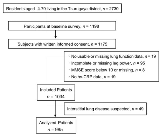 We invited all residents who were ≥70 years old to the Tsurugaya project in 2002 (n = 2730). Of 1198 participating subjects, 1175 provided written informed consent. Figure 1 shows a study flow chart. Nineteen subjects without spirometry data and 95 subjects with missing or incomplete leg extension power data were excluded. We excluded eight subjects with a Mini-Mental State Examination (MMSE) score below 10 or missing to maintain the reliability of the spirometry data. Nineteen subjects lacked high-sensitive C-reactive protein (hs-CRP) data. We excluded 49 subjects with respiratory symptoms to exclude potential interstitial lung disease patients. Finally, 985 subjects were analyzed.