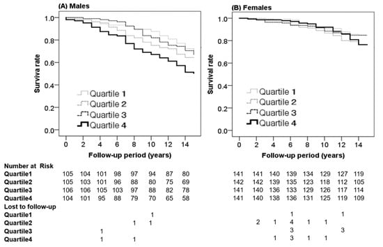 During the follow-up period of 13,011 person-years, of the 420 males, 154 (36.7%) died, and of the 565 females, 108 (19.1%) died. Figure 2 shows Kaplan–Meier survival curves according to the FVC% predicted in males (Figure 2A) and females (Figure 2B). The cumulative survival rates were significantly lower in the lowest FVC% predicted group Quartile 4 in males (log-rank test, p < 0.005), but there were no differences in females (log-rank test, p = 0.193). The number at risk in Figure 2 showed the number of individuals at risk of experiencing an event for each cohort during the follow-up period every 2 years. Figure 2 also showed the number of participants lost to follow-up every 2 years. These data suggest censoring occurred randomly, independent of the event.