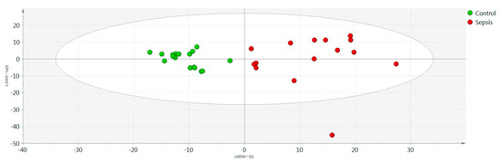 Univariate and multivariate statistical analyses were performed for the processed serum samples. The analytical performance proved to be satisfactory based on QC samples evaluation. OPLS-DA models showed a statistically significant difference between the sepsis and control groups (Figure 1). Characteristic values of the model were R2X = 0.889, R2Y = 0.796, Q2Y = 0.665, and CV-ANOVA = 0.005. Based on q-value, p(corr), and VIP values, eight metabolic variables were found to significantly contribute to the characterization of groups according to the adopted criteria (Table 1). Five out of the seven statistically significantly differentiated compounds were downregulated in the LOS group. Figure 2 illustrates the respective box plots of the most significant features based on the highest p(corr).