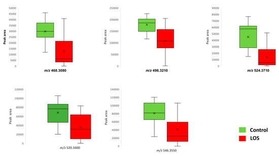Box plots of significant metabolites in the control and late-onset (LOS) groups.