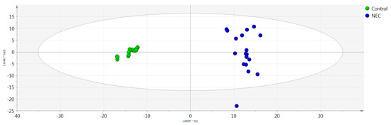 Orthogonal partial least squares discriminant analysis (OPLS-DA) score plots of the control and necrotizing enterocolitis (NEC) groups. Y and X axes represent [t2] and [t1], respectively.