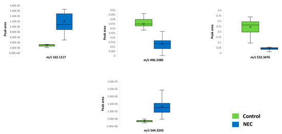 Box plots of significant metabolites in the control and necrotizing enterocolitis (NEC) groups.