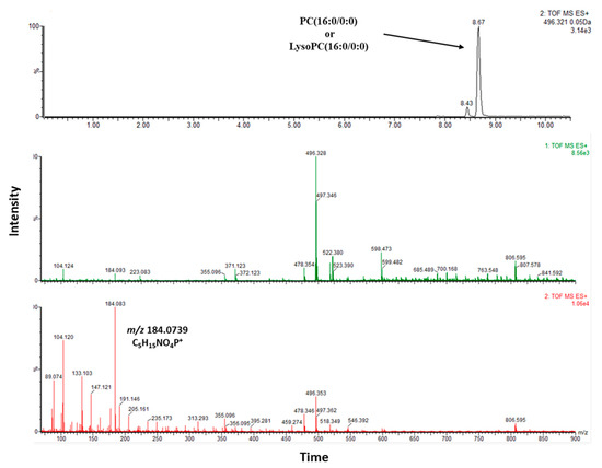 Lipid (tentative) identification was performed utilizing high-resolution mass spectra in MS and MS mode and aimed at recognizing head groups and lipid species. (Lyso)PCs can be identified in positive ionization mode as sodium and potassium adducts as well as in their protonated cationic form. Among the statistically significant features, lipids comprising the class of phosphatidylcholine(s) (PC)s were mainly identified covering different polarities. Identification was performed by a combination of either automatic and/Tor manual data manipulation and library searching. For all identified PCs, a characteristic head-group fragment m/z 184.0739 (C5H15NO4P+) was observed. In Figure 5, an example of a manually annotated PC is presented.