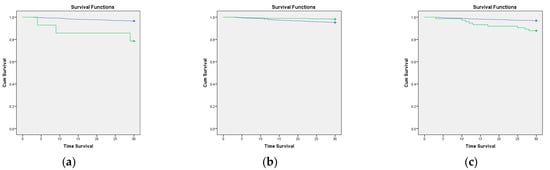 Kaplan–Meier curve of the 30-day survival rate according to COVID-19 status, CCI score, and comorbidities. The green line is patients who have that variable, and the blue line is patients without that variable. (a) COVID-19 status (log-rank p ≤ 0.01; (b) comorbidities (log-rank p ≤ 0.01); and (c) CCI > 3 (log-rank p ≤ 0.01).