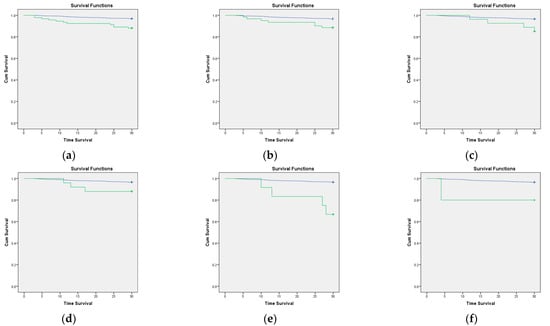 Kaplan–Meier curve of the 30-day survival rate of comorbidity in geriatric patients. The green line indicates patients with comorbidities, and the blue line indicates patients with no comorbidities. (a) Moderate-to-severe renal disease (log-rank p ≤ 0.01); (b) cerebrovascular disease (log-rank p ≤ 0.01); (c) diabetes with chronic complications (log-rank p = 0.03); (d) metastatic solid tumor (log-rank p = 0.02); (e) dementia (log-rank p ≤ 0.01), and (f) rheumatologic disease (log-rank p = 0.03).