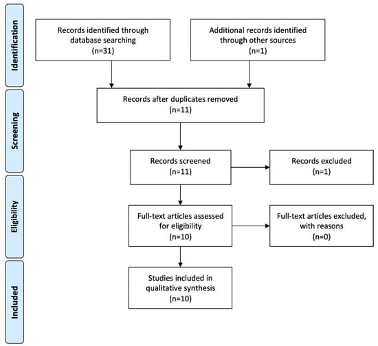 The electronic literature search yielded a total of 31 articles and the hand search one further article. After duplicates were removed, eleven articles remained. Of these, one was excluded after screening the abstract [20]. Ten articles fulfilled the inclusion criteria and were subsequently reviewed [7,8,9,10,11,12,13,14,15,16]. The flowchart summarizing the screening process is presented in Figure 1.