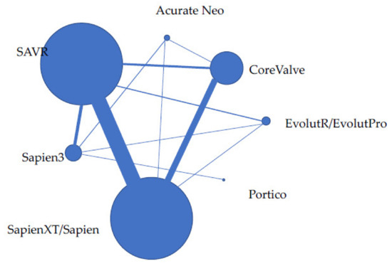Network diagram of various TAVI valves and SAVR for all-cause mortality. The size of the nodes is proportional to the number of individuals assigned to each valve and the thickness of the lines to the number of direct comparisons in studies.