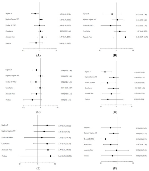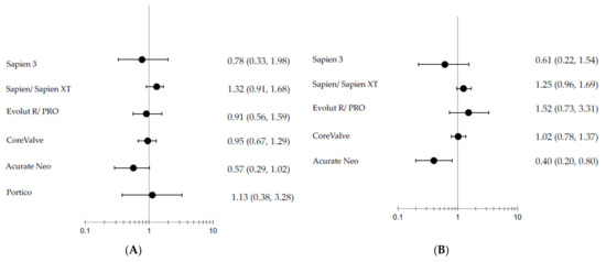 The following supporting information can be downloaded at: https://www.mdpi.com/article/10.3390/jcm11185299/s1, Figure S1: Forest plots of: (A) all-cause mortality, (B) cardiovascular mortality, (C) stroke, (D) bleeding, (E) vascular complications, (F) acute kidney injury, (G) pacemaker implantation, (H) rehospitalization, (I) atrial fibrillation, (J) aortic regurgitation, (K) endocarditis, (L) myocardial infarction, (M) heart failure NYHA III-IV, and (N) reintervention comparing various TAVI valves to SAVR in randomized controlled trials. Figure S2: Ranking chart of various TAVI valves and TAVI in (A) all-cause mortality, (B) cardiovascular mortality, (C) stroke, (D) bleeding, (E) vascular complications, (F) acute kidney injury, (G) pace-maker implantation, (H) rehospitalization, (I) atrial fibrillation, (J) aortic regurgitation, (K) endocarditis, (L) myocardial infarction, (M) heart failure NYHA III-IV, and (N) reintervention in randomized controlled trials. Table S1: Quality assessment of randomized controlled trials. Table S2: Quality assessment of observational studies. Table S3: Heterogeneity analysis.