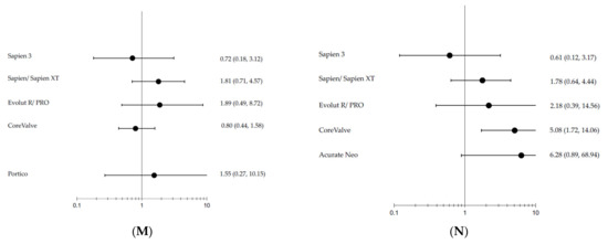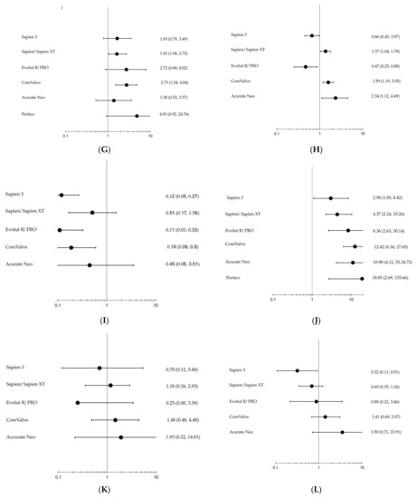 Forest plots of (A) all-cause mortality, (B) cardiovascular mortality, (C) stroke, (D) bleeding, (E) vascular complications, (F) acute kidney injury, (G) pacemaker implantation, (H) rehospitalization, (I) atrial fibrillation, (J) aortic regurgitation, (K) endocarditis, (L) myocardial infarction, (M) heart failure NYHA III-IV, and (N) reintervention comparing various TAVI valves to SAVR.