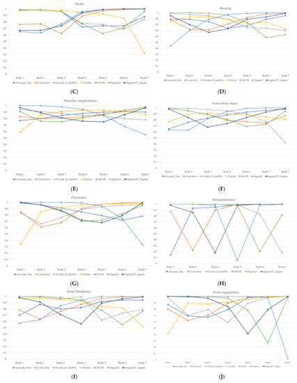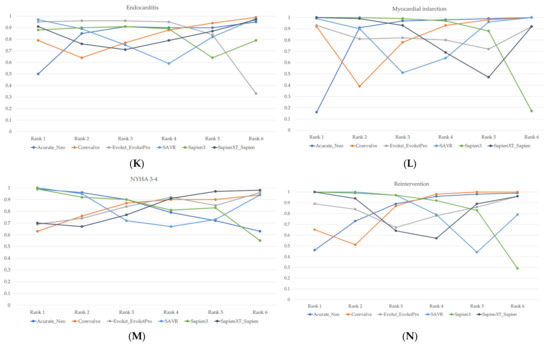 Ranking chart of various TAVI valves and TAVI in (A) all-cause mortality, (B) cardiovascular mortality, (C) stroke, (D) bleeding, (E) vascular complications, (F) acute kidney injury, (G) pace-maker implantation, (H) rehospitalization, (I) atrial fibrillation, (J) aortic regurgitation, (K) endocarditis, (L) myocardial infarction, (M) heart failure NYHA III-IV, and (N) reintervention.