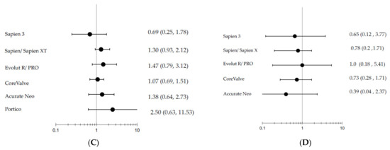 Forest plots of: (A) all-cause mortality, (B) cardiovascular mortality, (C) stroke, and (D) aortic regurgitation between various TAVI valves compared to SAVR in randomized controlled trials.