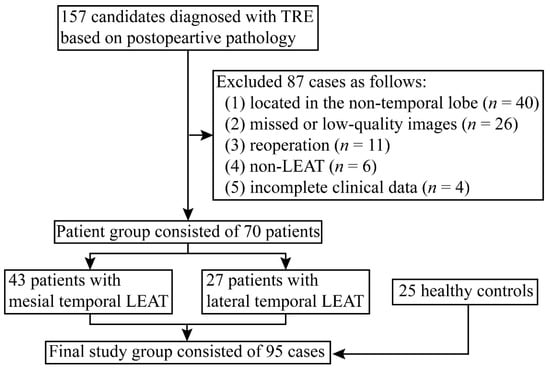 This study was approved by the Ethics Committee of the Beijing Tiantan Hospital (KYSQ 2021-366-01), and written informed consent was obtained from all participants. Between January 2015 and December 2020, 157 consecutive participants diagnosed with tumor-related epilepsy (TRE), based on postoperative pathology, were enrolled. All of them had the accordant anatomical–electroclinical correlations in presurgical evaluation, and 87 patients were excluded as: (1) the tumor was not located in the temporal lobe; (2) there was missed or low-quality neuroimaging; (3) there was reoperation; (4) the result was not a LEAT; and (5) there was incomplete clinical data. We then divided the 70 included patients into mesial temporal LEAT and lateral temporal LEAT groups. Twenty-five healthy controls were included for the purpose of metabolic pattern analysis (Figure 1).
