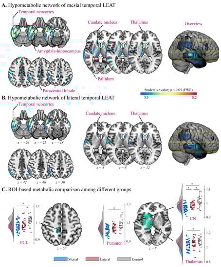 Group-level alterations in metabolism in patients with temporal lobe long-term epilepsy-associated tumors (LEAT). (A,B) Voxel-based t statistical parametrical map demonstrated the hypometabolic networks of mesial and lateral temporal LEATs, respectively. FWE: family-wise error. (C) Within-group comparison of the region of interest (ROI)-based metabolic value derived from significant group comparison. *: p < 0.05 (Bonferroni correction); PCL: paracentral lobule; CN: caudate nucleus; PET values among groups are expressed in boxplot as mean and standard deviation (SD).