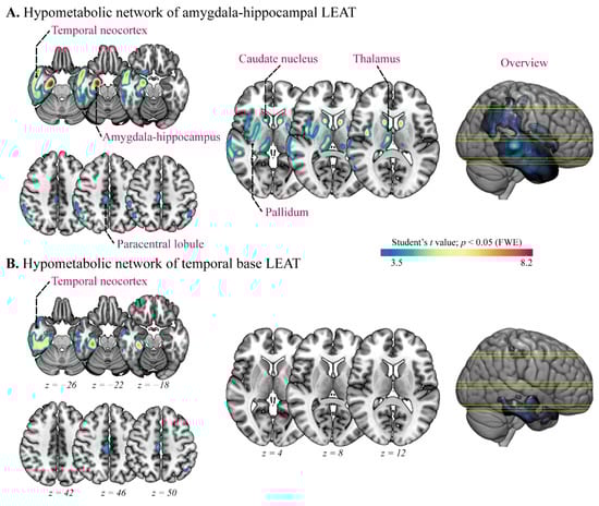 Subgroup analysis of metabolic alteration in mesial temporal lobe long-term epilepsy-associated tumors (LEAT). (A,B) Voxel-based t statistical parametrical map demonstrated the widespread hypometabolic networks of amygdala–hippocampal and temporal base LEAT groups, respectively. FWE: family-wise error.